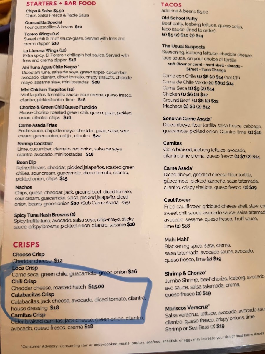 Fried cauliflower, griddled cheese shell, poblano slaw, crema, sweet chili sauce, avocado sauce. salsa tatemada, avocado, sesame, queso fresco. Truff sauce, lime (2)