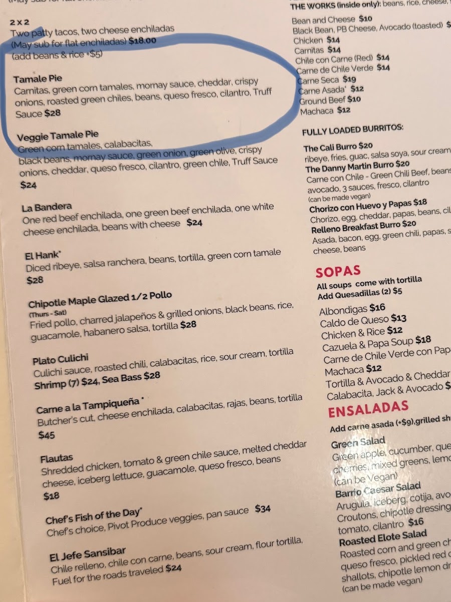 Green corn tamales, calabacitas, black beans, mornay sauce, green onion, green olive, crispy onions, cheddar, queso fresco, cilantro, green chile, Truff Sauce